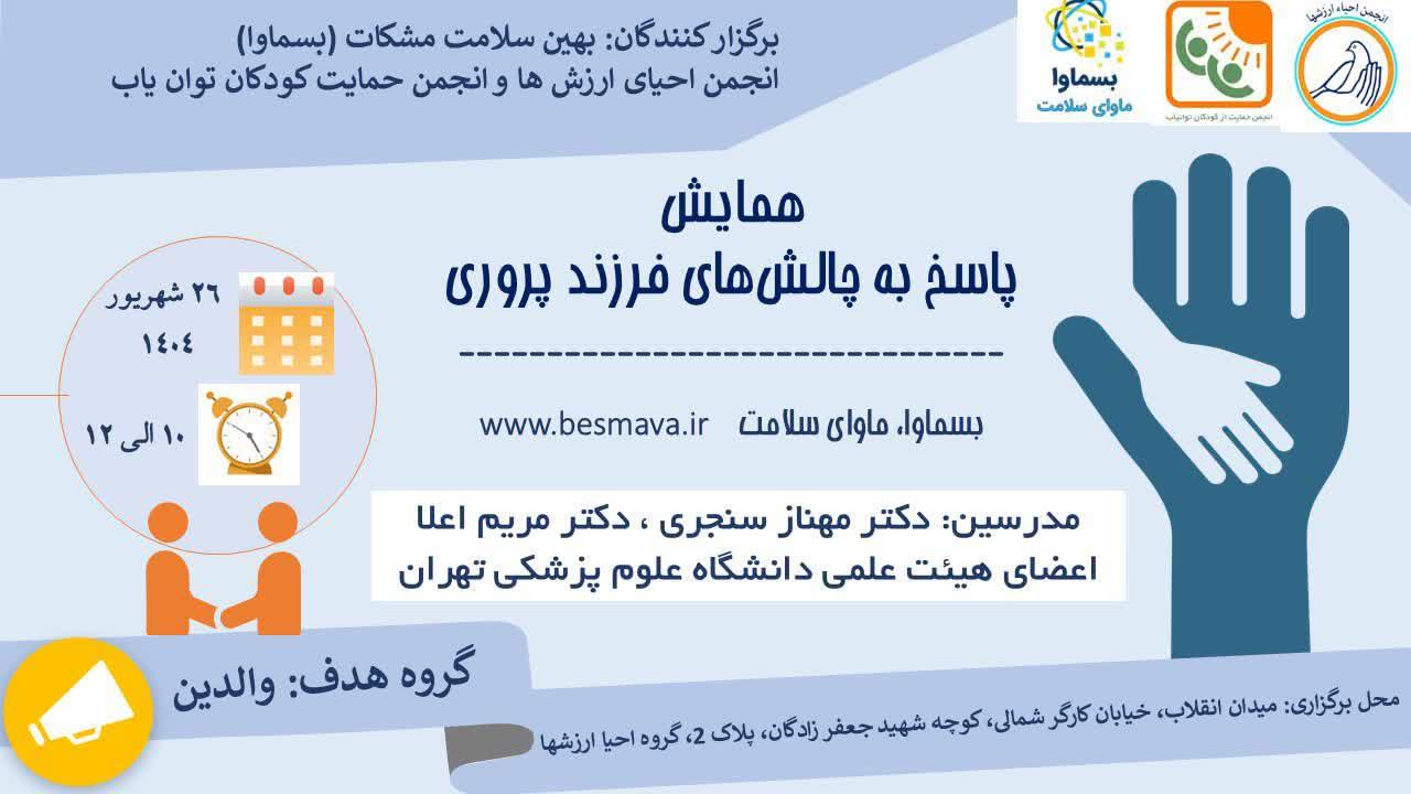 همایش «پاسخ به چالشهای فرزندپروری» روز ۲۶ شهریور ۱۴۰۴ به همت موسسه بهین سلامت مشکات (بسمـاوا)، انجمن احیای ارزشها و انجمن حمایت کودکان توانیاب در تهران برگزار شد. این برنامه از ساعت ۱۰ تا ۱۲ و با حضور جمعی از والدین به عنوان گروه هدف اصلی برپا گردید.